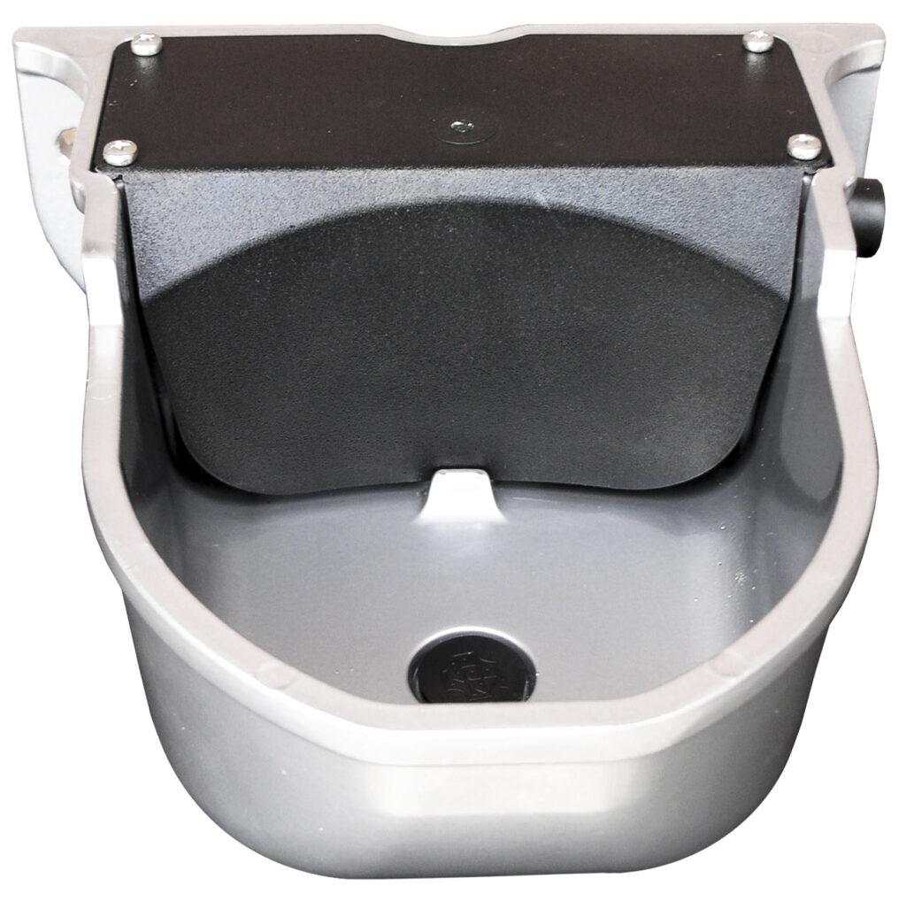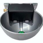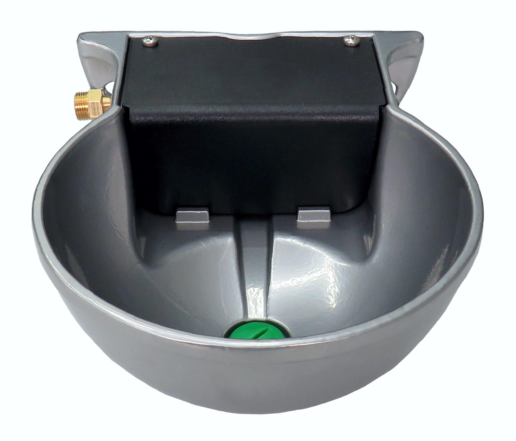 Bebedouro em alumínio pintado com abraçadeira e capacidade para água de 1,85 litros. Conexão de 3/8″ e tomada de água lateral. Boia pequena. Nível de água constante.