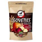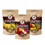 A deliciosa comida de recompensa que não deixa desperdício! os leoveties não são apenas muito saborosos, mas também sustentáveis e ecológicos e as primeiras guloseimas que não deixam resíduos. É 100% compostável e pode ser descartado na lixeira verde ou no lixo orgânico. Em comparação com a produção de uma sacola plástica PET, 50% a 60% de CO2 são economizados durante sua produção. Os leoveties são deliciosos e vão agradar ao seu cavalo. Os leoveties estão disponíveis em três deliciosos sabores. Banana, açafrão e linhaça, depois maçã, espelta e beterraba vermelha, além de cenoura, manga e rosa mosqueta.