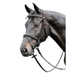 Uma cabeçada inglesa em relevo, com costuras Fancy. A focinheira atravessa a cachaceira. Rédeas que combinam, disponíveis: rédeas de lona (E34) ou rédeas de borracha (E36).