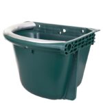 Comedouro de modelo de canto de polipropileno com moldura de alumínio. Por causa do formato o cavalo não pode morder no comedouro. Os dois suportes prendem o comedouro à parede.